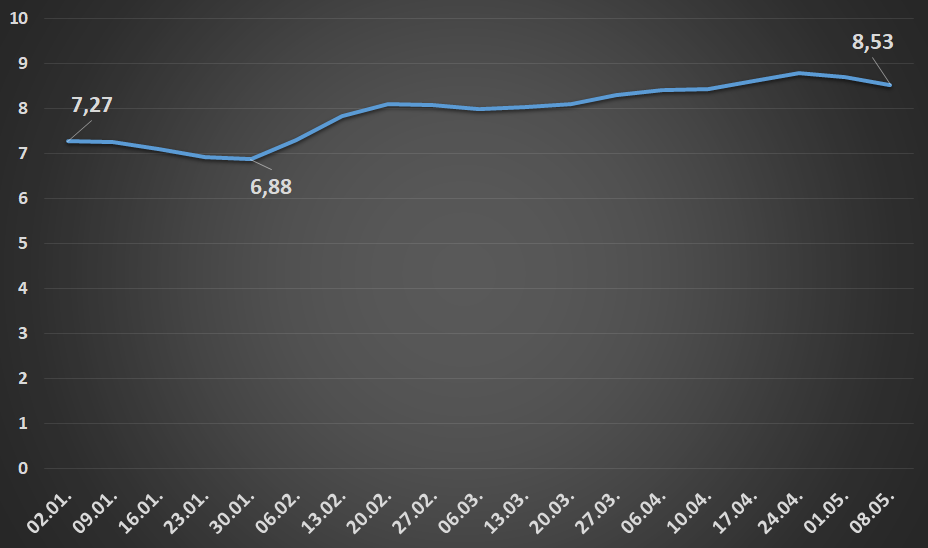 Poniżej aktualne ceny skupu tucznika w okresie od stycznia do maja 2023r.