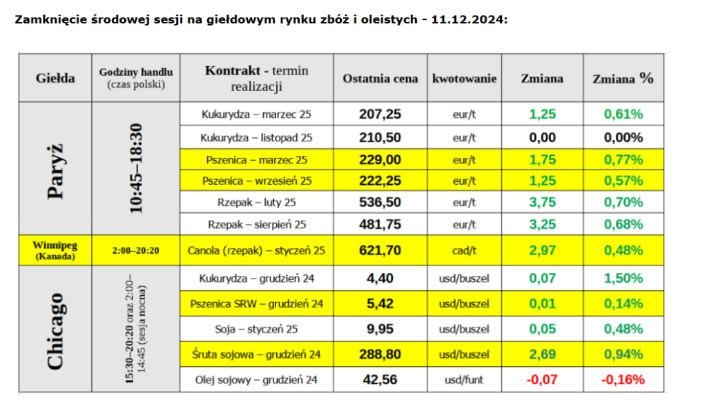 Kukurydza w Paryżu (kontrakt na tegoroczny zbiór) korzystała w ostatnich dwóch dniach z cięcia oczekiwanych w USA zapasów tego zboża w grudniowym raporcie USDA. Seria z dostawą w marcu 2025 podrożała do 208,5 eur/t na zamknięciu środowej sesji. Dla przypomnienia, grudzień zaczął się od spadku na 3-miesięczne minima w okolicy 200 eur/t po tym, jak KE podniosła swoje szacunki zbiorów kukurydzy we Francji i w skali całej UE.