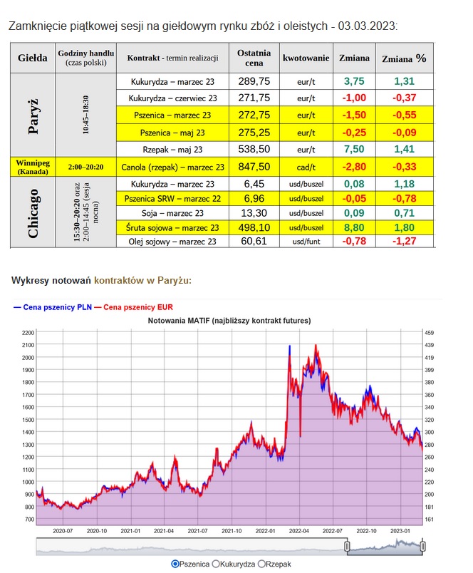 W piątek (03.03.2023) wycena pszenicy z dostawą w marcu (obrót kończy się 10-go marca) ustalona została poniżej 273 eur/t – okolice 12-miesięcznego dołka. Wycena terminu majowego jest tylko minimalnie wyższa.