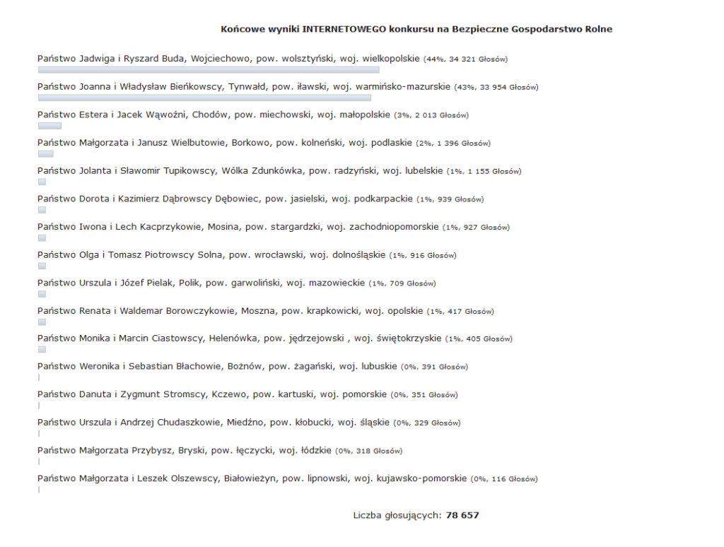 Spośród 16 najbezpieczniejszych gospodarstw wybranych przez wojewódzkie komisje konkursowe do etapu centralnego, nasi widzowie wybrali JEDNO – najbezpieczniejsze ich zdaniem gospodarstwo rolne.