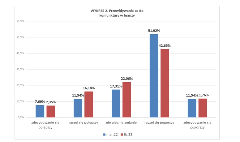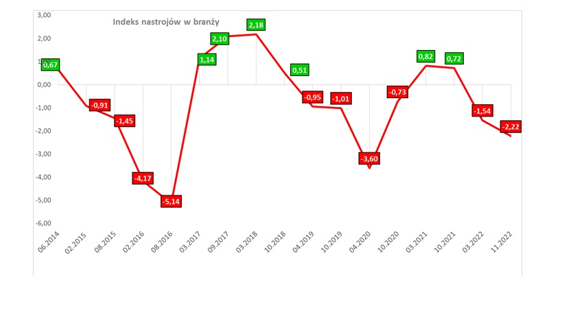 Wypadkową badania jest współczynnik obrazujący nastroje w branży. Wartość poniżej zera świadczy o przewadze nastrojów negatywnych i pesymistycznych. Tym razem, mamy do czynienia z przewagą odpowiedzi negatywnych co widać w wyniku indeksu. Ma on wartość ujemną, co oznacza, że wśród przedsiębiorców dominują negatywne nastroje i pesymistyczne przewidywania przyszłości. Pesymistyczne nastroje jeszcze się pogłębiają w stosunku do poprzedniego cyklu badania. Wartość indeksu spada o 0,68 punktu i obecnie przyjmuje wartość -2,22.