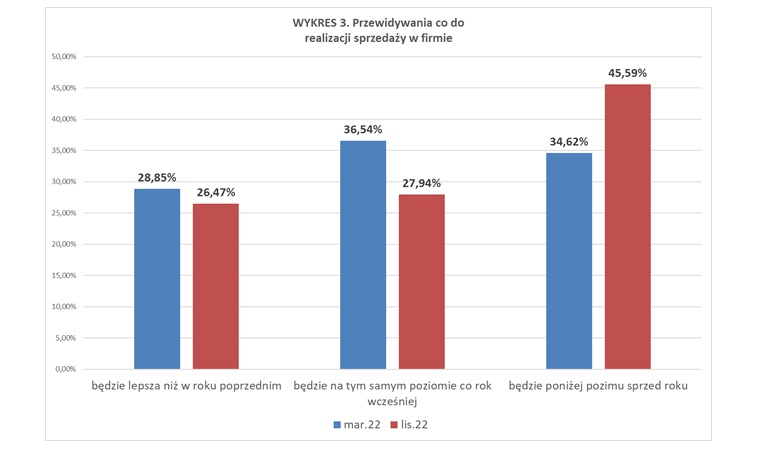 Jeżeli chodzi o koniunkturę, obecnie ponad 54% badanych przewiduje, że się ona pogorszy w niewielkim lub znacznym stopniu. W marcu br. pogorszenie koniunktury przewidywało ponad 65% badanych. (WYKRES 2). Zwiększył się natomiast odsetek odpowiedzi dotyczących pogorszenia sprzedaży we własnych firmach. Gorszego wyniku niż wiosną spodziewa się 45,59% respondentów (WYKRES 3) w stosunku do 34,62% w poprzednim cyklu badania.