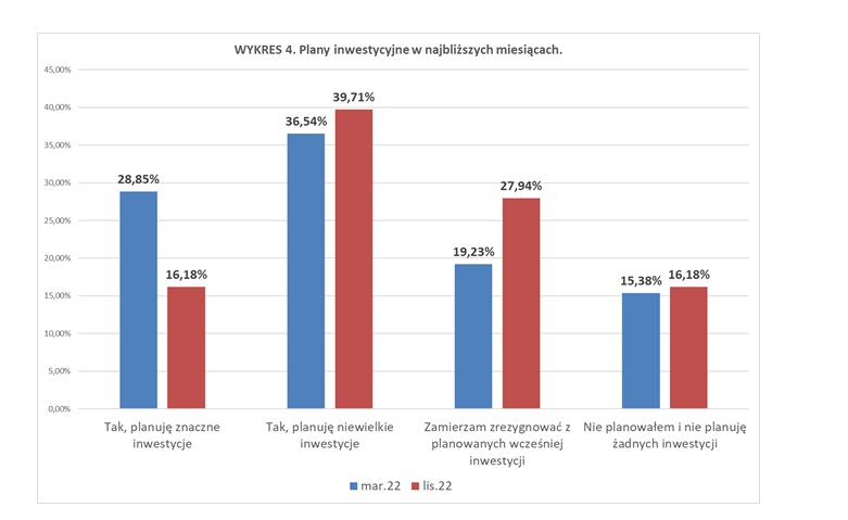 Wzrost pesymizmu widać w odpowiedziach dotyczących planowanych inwestycji. I jest to bardzo wyraźne. W marcu br. niemal 29% przedsiębiorców planowało znaczne inwestycje, obecnie jest to już tylko 16,18% wskazań. Wzrósł także odsetek dotyczący rezygnacji z wcześniej zaplanowanych inwestycji. Wiosną ponad 19% firm zapowiadało rezygnację z inwestycji, obecnie jest to niemal 28% firm (WYKRES 4).