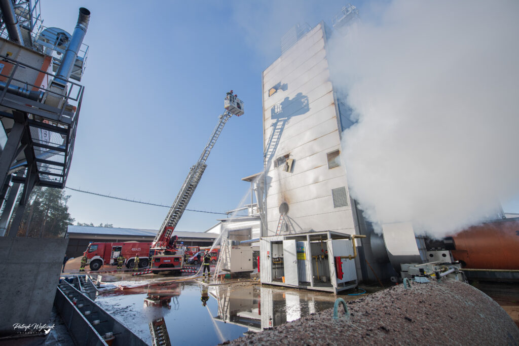 Pierwsze jednostki, które dotarły na miejsce, natychmiast rozpoczęły akcję gaśniczą. Strażacy podawali prądy wody do wnętrza suszarni, starając się powstrzymać ogień, który tlił się głęboko w ziarnie kukurydzy. Sytuację komplikował ograniczony dostęp do środka instalacji – wysoka temperatura i gęsty dym utrudniały działania ratownicze.