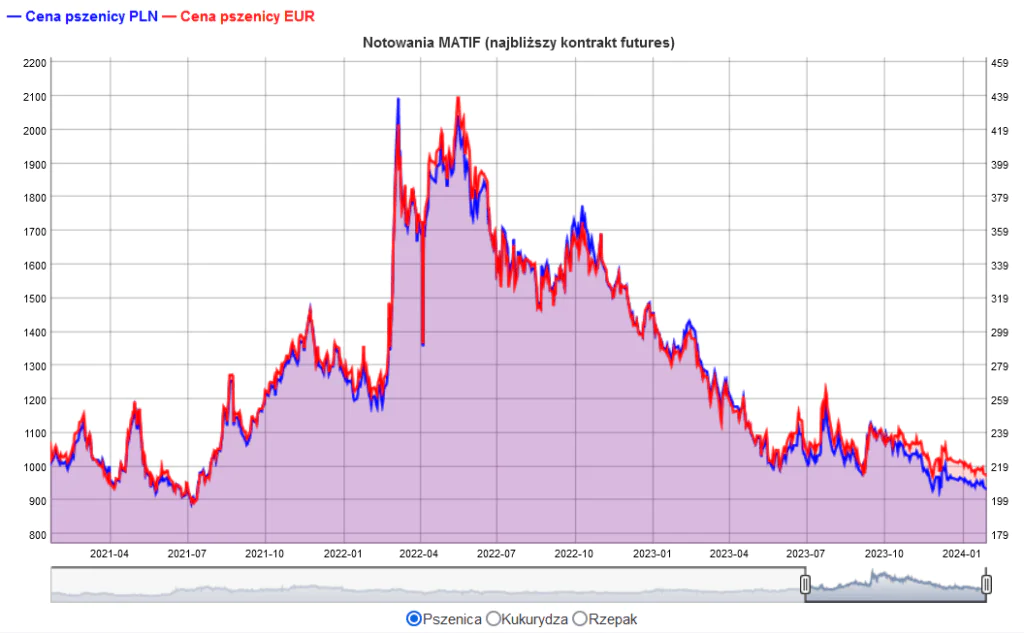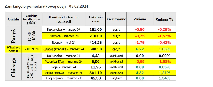 W Paryżu marcowa seria unijnej pszenicy straciła na wartości 3,5 euro do 210 eur/t – było to najniższe zamknięcie serii od września 2021. Kukurydzy straciła 0,5 euro do 181 eur/t, co jest ceną o 0,25 euro wyższą od historycznego dołka terminu marcowego z minionego czwartku.