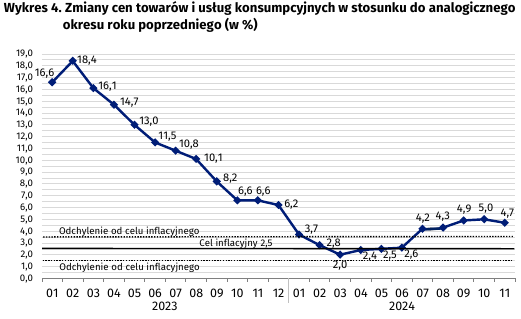 Według finalnego raportu GUS (z 13.12.2024) ceny towarów i usług konsumpcyjnych wzrosły w listopadzie o 4,7% (5,0% w październiku) w porównaniu z analogicznym miesiącem ubiegłego roku.