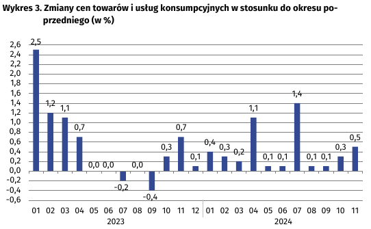 W tym ceny towarów wzrosły o 3,8%, a usług aż o 7,2% w skali roku. Listopadowy wynik okazał się nieco wyższy zarówno od rynkowych prognoz (4,6%) jak i od „szybkiego szacunku” opublikowanego przez GUS dwa tygodnie wcześniej (4,6%). Większość ekonomistów spodziewa się, że w najbliższych miesiącach inflacja CPI ponownie wzrośnie i przez pierwszą połowę 2025 roku będzie przekraczać 5%. Największa zmiana rocznej ceny dotyczyła energii elektrycznej i masła (w górę) oraz cukru (w dół).