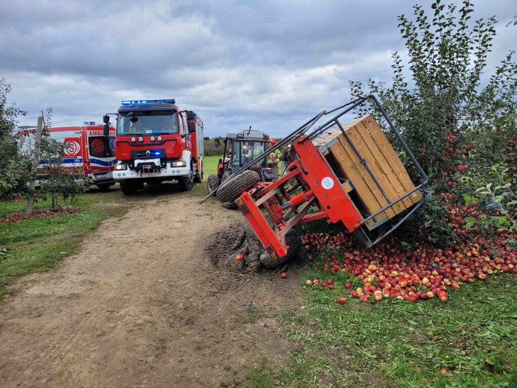 Po przyjeździe zastępów Straży Pożarnej na miejsce zdarzenia stwierdzono, że na zakręcie doszło do przewrócenia się platformy do zrywu jabłek. Dwie pracownice będące na platformie zostały przygniecione. Osoby postronne i świadkowie zdarzenia uwolniły obie osoby przed przybyciem zastępów.